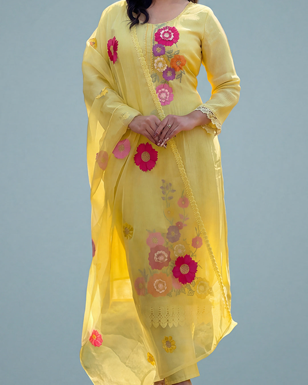 Radiate effortless elegance in this beautifully crafted Pure Muslin Kurta Set, designed to bring freshness and grace to your wardrobe. The soothing sunshine-yellow base is enhanced with vibrant floral work, creating a perfect balance of softness and statement charm.