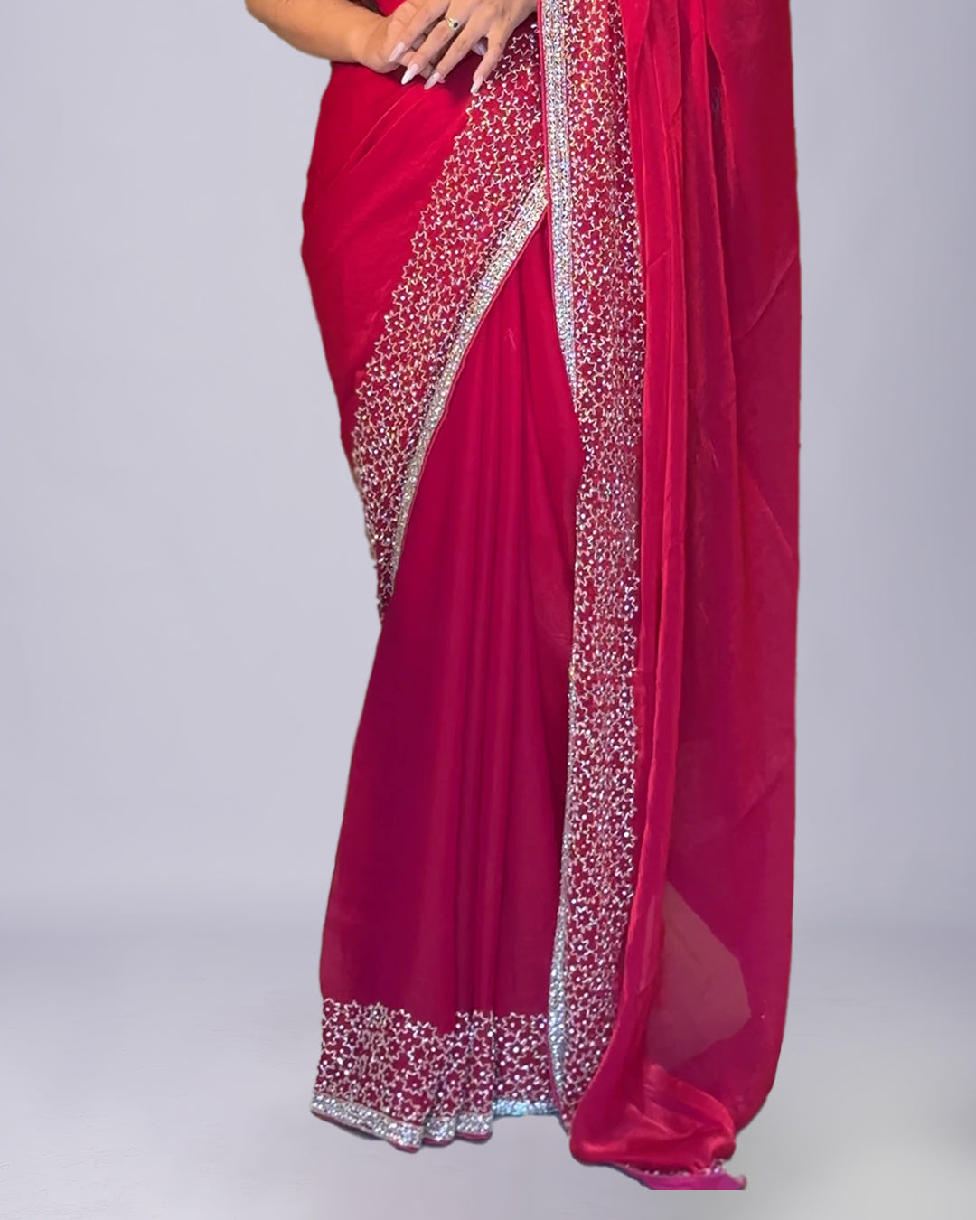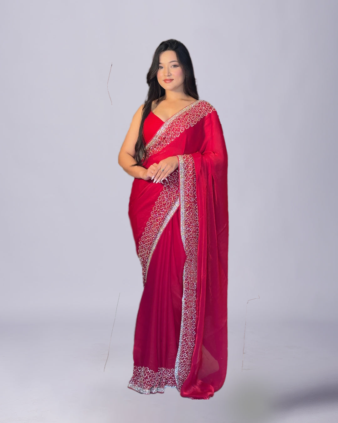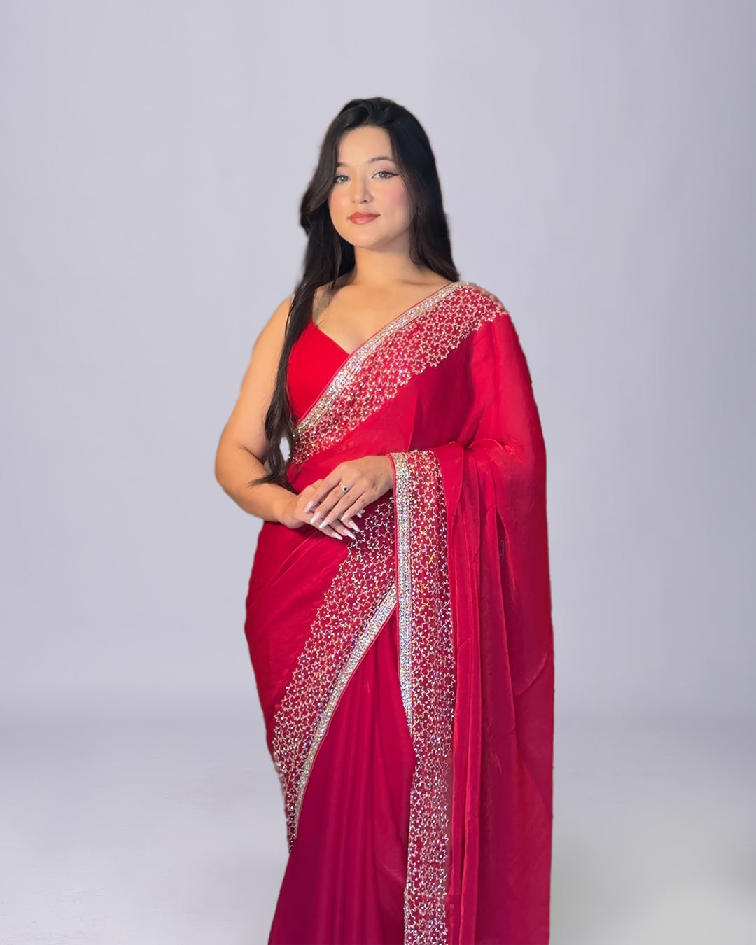 Lightweight and sheer, this red organza saree is designed to offer a regal yet airy look. The crisp texture of the fabric creates a structured, graceful silhouette ideal for festive wear.