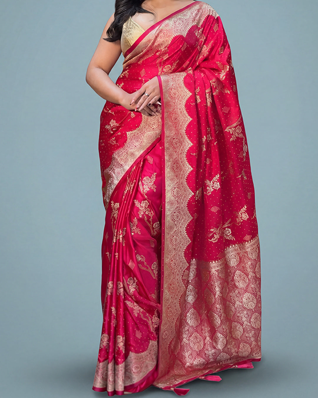 Work: Traditional Banarasi woven motifs with heavy zari border