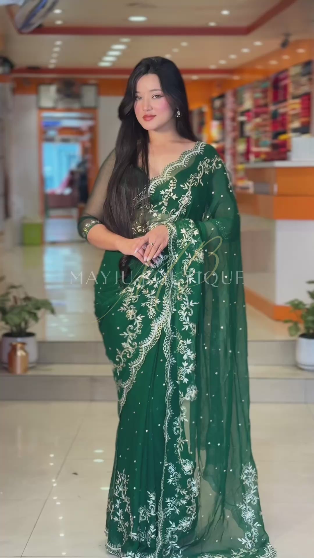 Elevate your ethnic wardrobe with this stunning French chiffon saree in a rich emerald hue. Crafted from pure chiffon, the saree features intricate thread embroidery and elegant zari work throughout, adding a touch of sophistication and grace. The beautifully detailed cut work border enhances its overall charm, making it perfect for festive occasions and celebrations. Paired with an attached blouse piece, this saree blends tradition with contemporary finesse.