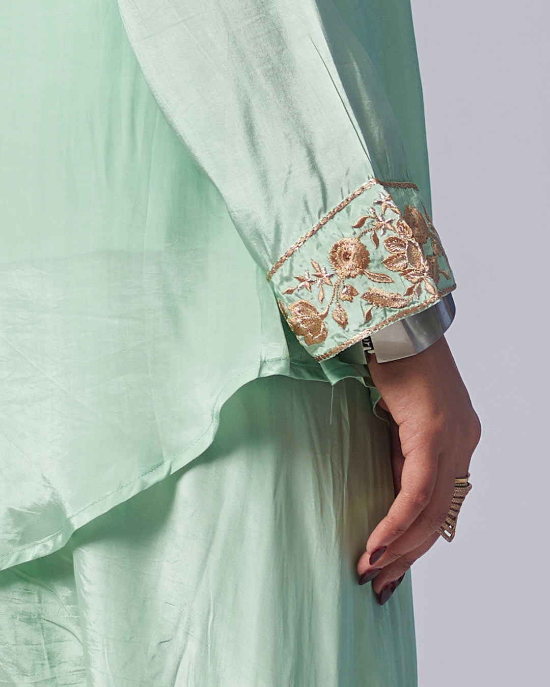 • Design: Crafted in a flowy asymmetrical silhouette with a soft sheen, the kurthi showcases intricate thread embroidery in floral and paisley motifs across the neckline and cuffs—adding a delicate charm.